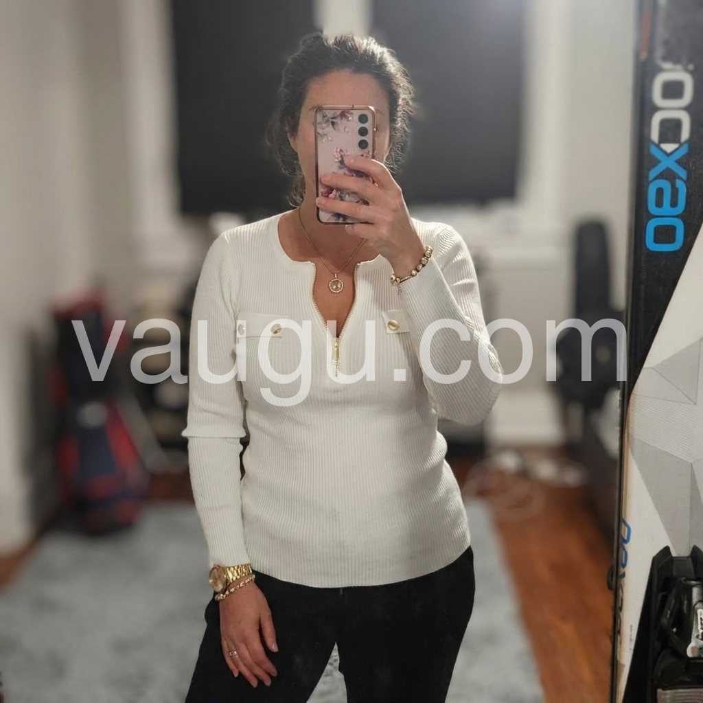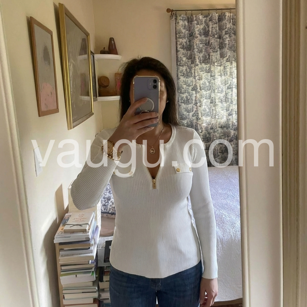 Elevate your wardrobe with our Chic Zip V-Neck White Plain Knit Top. The stylish v-neck neckline and subtle zip feature add a touch of sophistication to any outfit. Made from high-quality, soft knit material, this top is both comfortable and versatile. Perfect for any occasion, elevate your style with this must-have piece.