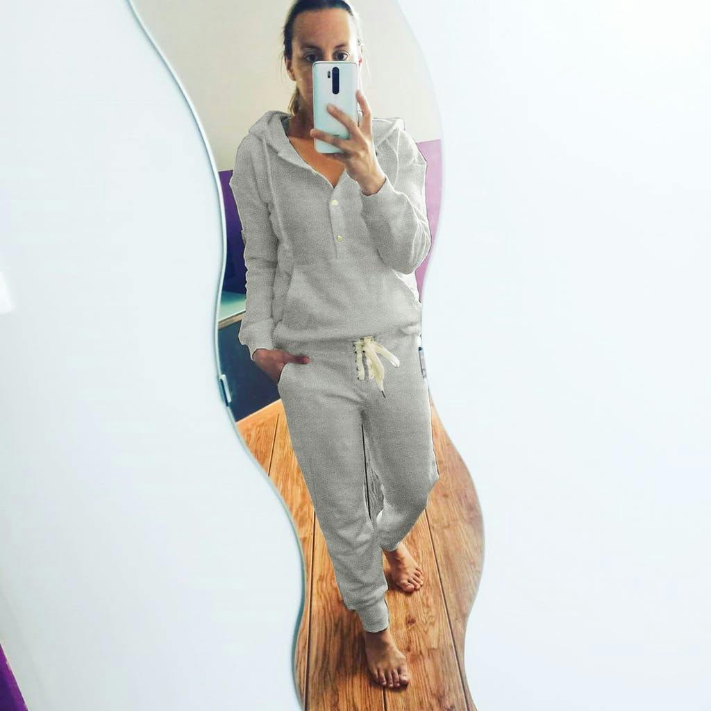 Loungewear gets an upgrade with this stellar heather grey set cute enough to wear all over town. A warm hoodie with golden snaps and a kangaroo pocket coordinates with slim sweatpants featuring a fashionable lace-up top and slant pockets. Layer it with a lace-trimmed camisole for a modern, flirty touch.