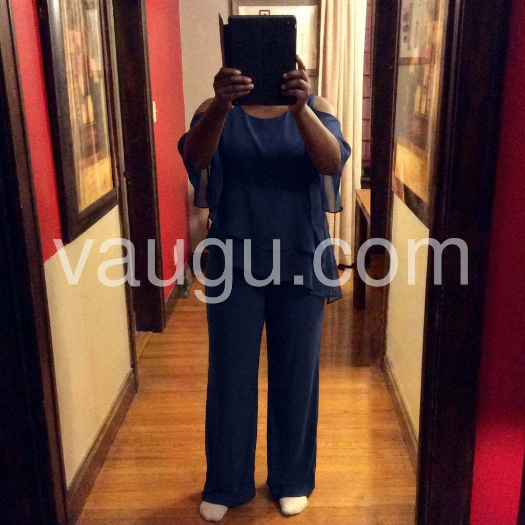 This fashionable two-piece set includes a navy cold shoulder three-quarter length draped sleeves andย asymmetrically layeredย ruffled top and pants. Crafted from lightweight and soft materials, this set is perfect for any occasion. Step up your look with this stylish set.