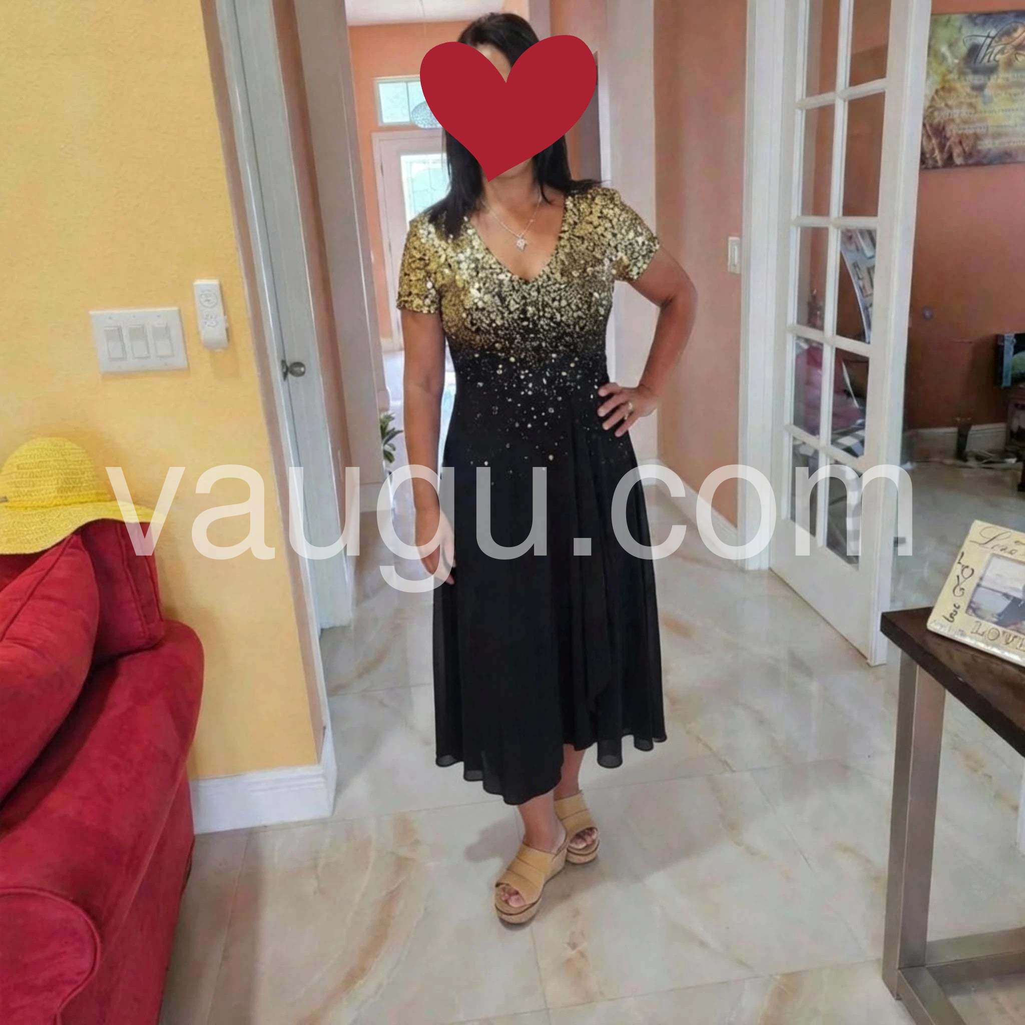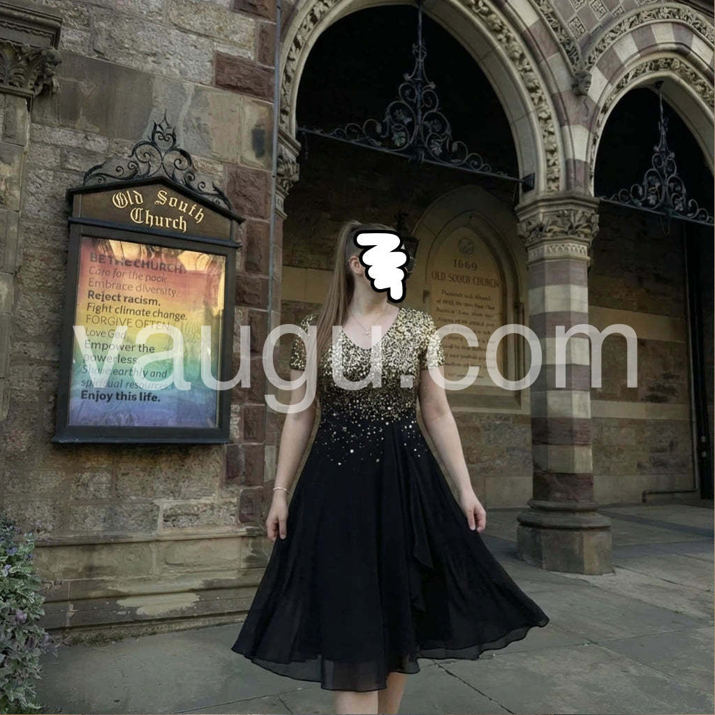 This elegant V-neck midi dress combines sophisticated design with practical comfort. The short sleeves offer versatility for various occasions, while the flattering V-neckline enhances your neckline. The midi length provides a balanced silhouette suitable for both professional settings and social gatherings. Crafted with attention to detail, this stunning dress will become a cornerstone piece in your wardrobe rotation.