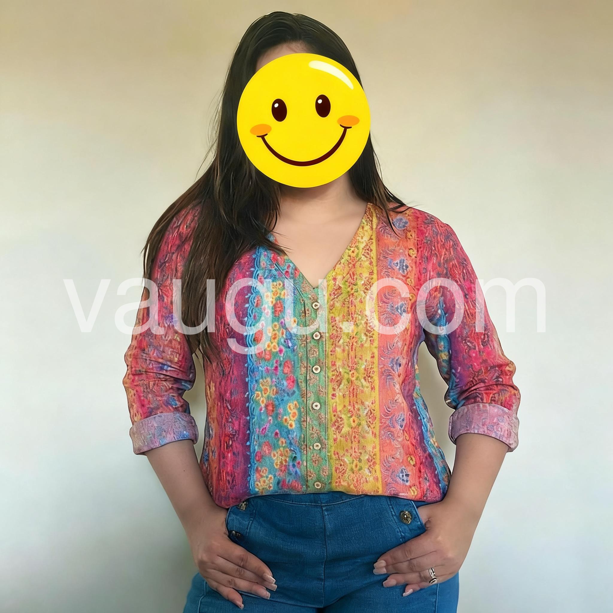 Embrace free-spirited style with this Stunning Colorful Boho Print Top, a vibrant and eye-catching piece that brings bold artistry to everyday wear. Crafted from lightweight, breathable fabricโlikely cotton or rayon blendโthis long-sleeve tunic features a richly detailed print combining floral motifs, paisley patterns, and vertical stripes in a lively mix of fuchsia, turquoise, mustard yellow, and deep purple. The relaxed, flowy silhouette drapes beautifully, offering comfort and ease while the V-neckline and front button closure add a touch of classic structure. With sleeves that roll up easily for a casual look, itโs perfect for pairing with jeans, leggings, or flowy pants. Styled here with layered necklaces and bracelets, it captures the essence of bohemian elegance with a modern twist. Ideal for weekend outings, summer days, or adding a burst of personality to your wardrobe, this tunic top celebrates color, culture, and effortless charm. Let your style shine with this joyful, artistic statement piece.